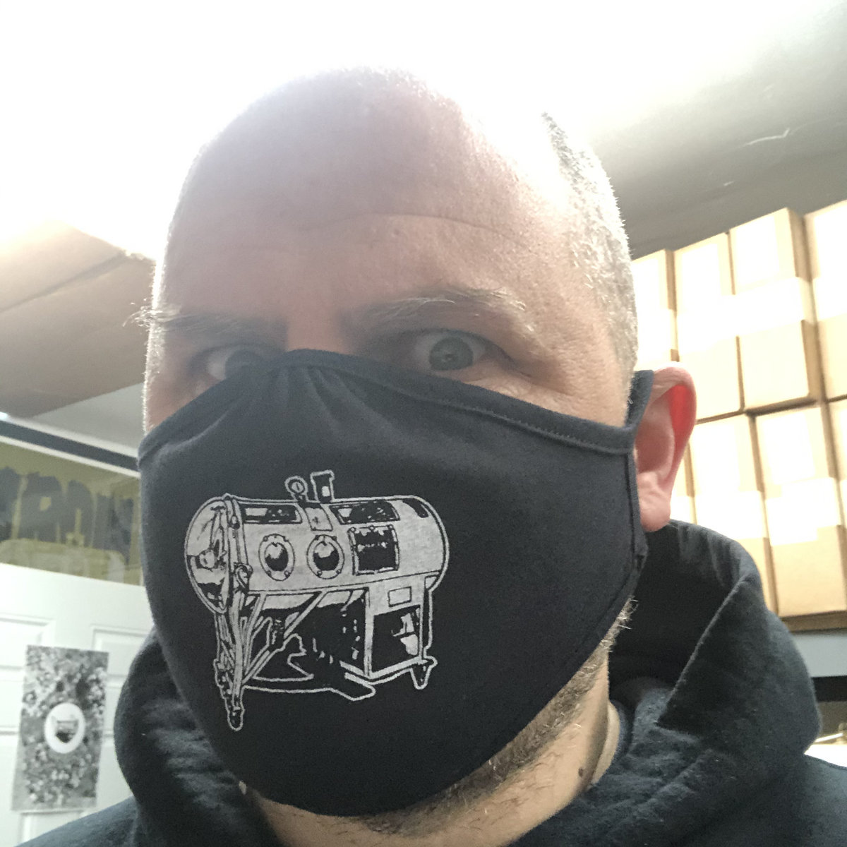 White ink on a black 40% Recycled Poly, 30% Recycled Cotton, 30% Cotton blend ear loop mask. Comes with a postcard and sticker.